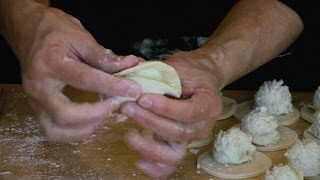 To make sweet potato filled pierogi, I just used my regular recipe (sort of) for Potato and Cheese Filling and substituted sweet potatoes for the baking potatoes (Russets). First, boil the sweet potatoes in their skins and then rice (or mash) and add to the rest of the ingredients. You may want to use a mixture of both potato types, because the sweet potatoes have a lot more moisture in them, making it more difficult to pinch and seal. Feel free to experiment with quantities. I made a small batch with just a couple of small sweet potatoes. added a bit of cheese and onions without measuring. They were sweetly delicious!